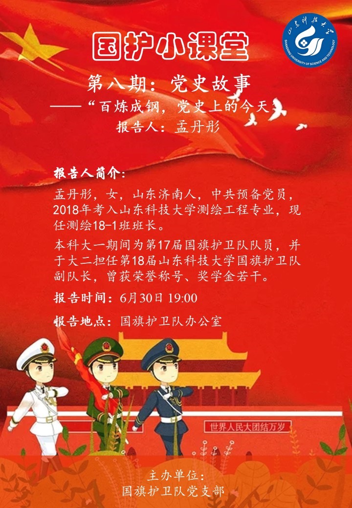6月30日,为庆祝中国共产党成立100周年,山东科技大学国旗护卫队党支部开展国护小课堂第八期,支部全体党员同志参加。本次国护小课堂活动,由孟丹彤同志主讲,主要从以下两个方面讲述了中国共产党成立100年的历程。首...