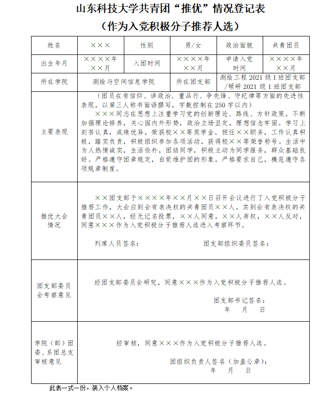 山东科技大学共青团“推优”情况登记表(作为入党积极分子推荐人选)样例: