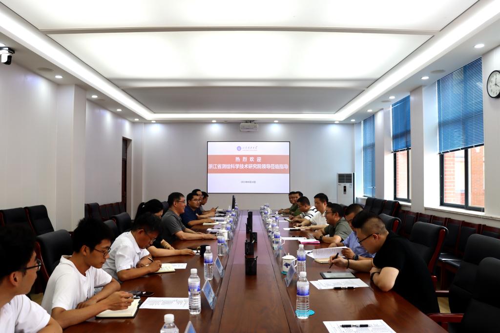 阳凡林对金利强一行的到访表示热烈欢迎,向浙江省测绘科学技术研究院对学校工作的关心支持表示感谢,并从学科建设、科学研究、人才培养等方面介绍了学校发展现状及近年来取得的办学成果。秦昌盛介绍了学院近年来建设与发展、师资力量引进、人才培养等基本情况。徐莹介绍了学院专业设置、学科建设、科研合作等相关情况。
