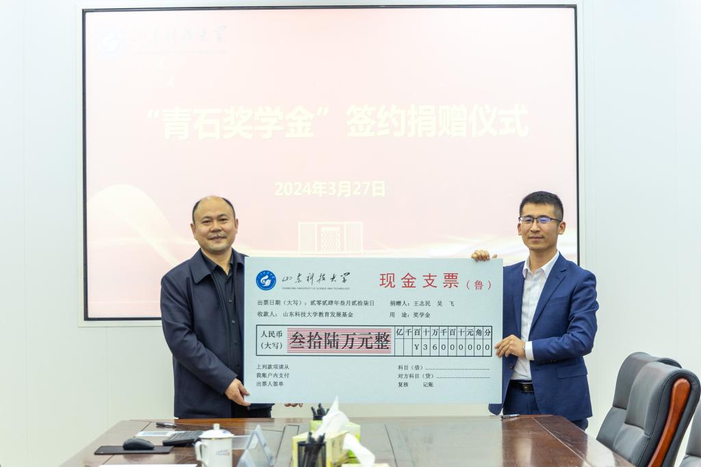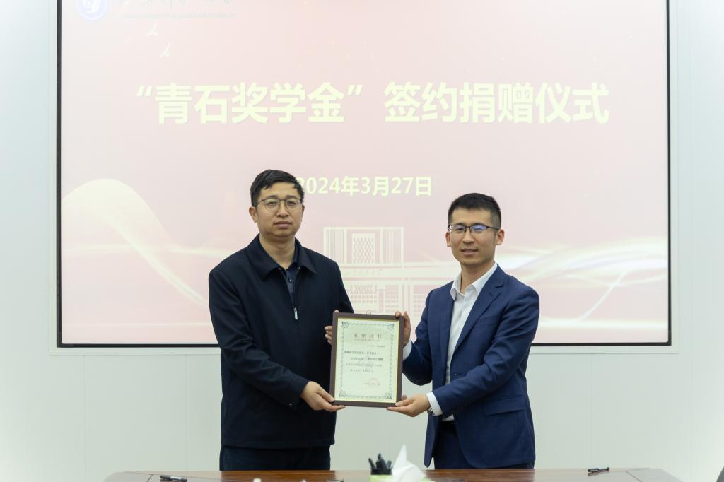 本科地信2007级校友、华信青石控股集团董事长、青石公益发起人王志民,本科地信2007级校友吴飞,以个人名义共同向学院捐赠36万元设立“青石奖学金”。校党委常委、副校长阳凡林出席捐赠仪式,并为王志民校友颁发捐赠证书。
