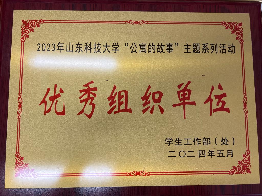 在本次表彰大会中喜获2023年度学生公寓安全文明管理工作先进单位、2023年度学生社区建设工作先进单位、2023年山东科技大学“公寓的故事”主题系列活动优秀组织单位,32个学生宿舍荣获山东科技大学2023年度“文明宿舍”称号,王若舟同学的征文作品《“寓”见青春,“宿”说美好》荣获山东省教育厅一等奖,韩雪丽老师的公寓育人精品课《流行传染病预防篇》荣获山东省教育厅三等奖,辅导员韩雪丽被评为山东科技大学2023年度学生公寓安全文明管理工作先进个人。
