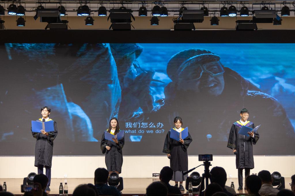 在“奋楫笃行”篇章中,艾波老师与研究生毕业生们共同唱响《启程 再见》,“向过去的悲伤说再见”“好好珍惜现在”,老师勉励学生、学生惜别老师,真挚的师生之情令人动容;朱中原同学的《00后脱口秀》诙谐幽默,于开怀大笑中引人思考;王铉霖等同学带来的舞蹈《绮梦翩跹》,展现了对美好未来的憧憬;晚会在师生合唱《那些年》中圆满落下帷幕。