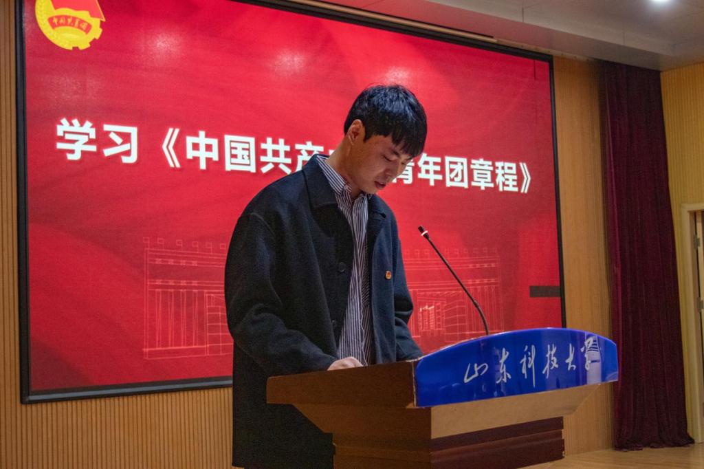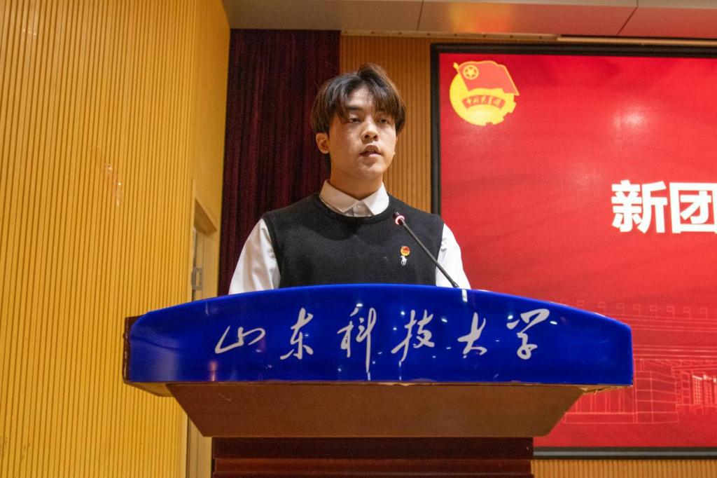 仪式在庄严的国歌声中拉开帷幕。化工学院辅导员孙梦柯宣读《中国共产主义青年团章程》中有关团员义务和权利的条款。耿倩宣读新发展团员名单,并向新团员代表颁发团员证。易凡、马韶霞为新发展团员代表佩戴团徽。38名新团员在领誓人王宏力的带领下,面向团旗庄严宣誓,活动现场全体团员重温入团誓词,他们用最洪亮的声音喊出自己的名字,表达出自己勇担时代重任的决心。新团员代表付宇轩和优秀团员代表王奕苏分别发言。随后,材料学院党委副书记兼副院长李建楠宣读青马工程基础班方案,并详细介绍培训内容和目标。