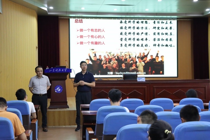 报告开始,阳凡林院长介绍了刘春教授。刘春教授作为我校优秀的校友之一,他在自己的领域研究成果丰硕,并多次获得各级各类荣誉和奖励。报告会上,刘教授首先讲到,正确的规划个人的研究、生活、人生是非常重要的。他结合自己在山东科技大学求学期间的科研经历,鼓励大家努力学习,去更高的平台发展自己,实现自己的人生价值。他多次提到帮助过自己的老师和同学,并表达了对他们深深的感激之情。随后,刘教授传授了在带领科研团队方面的许多经验,讲了带领学生实习调查、深入研究,对于个人品性的锤炼十分重要。同时,刘春教授还强调了创新的重要性,认为创新驱动服务社会,我们学到的知识最终要服务于大众,服务于社会,让自己的研究成果价值得以体现。报告最后,刘春教授向大家展示了自己科研之外的生活情况,介绍了自己的爱好。他希望大家用丰富多彩的业余生活充实自己,保持健康向上的心态,快乐的科研。