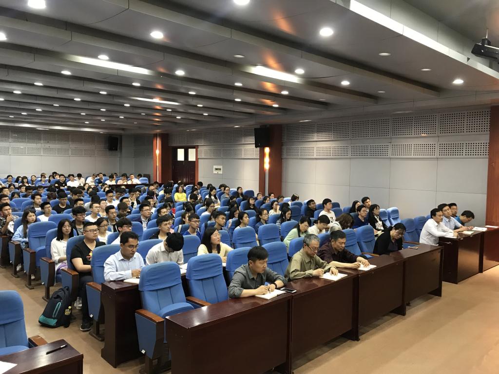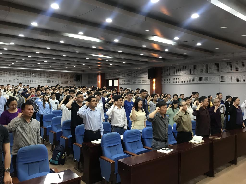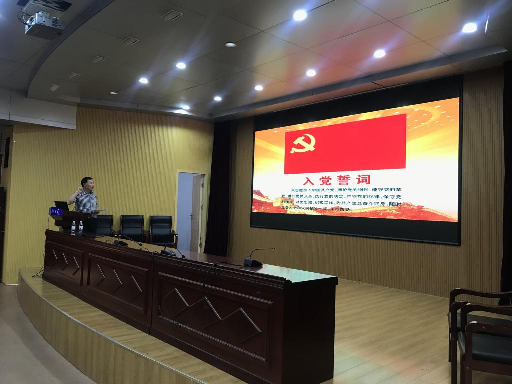 党委书记朱建国为学院全体教职工及学生党员、入党积极分子讲授党课。朱书记以“中国共产党入党宣誓和入党誓词的沿革”为题,从入党宣誓的沿革、如何组织入党宣誓、入党誓词的沿革和重温入党誓词四个层面展开了生动精彩的讲授。