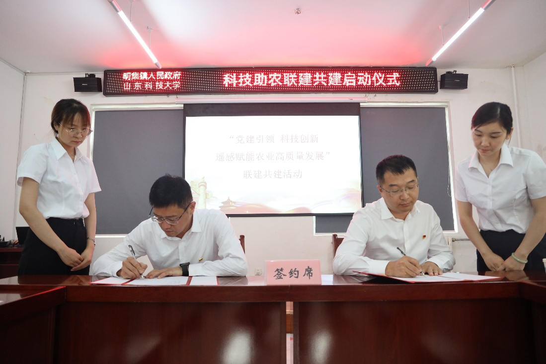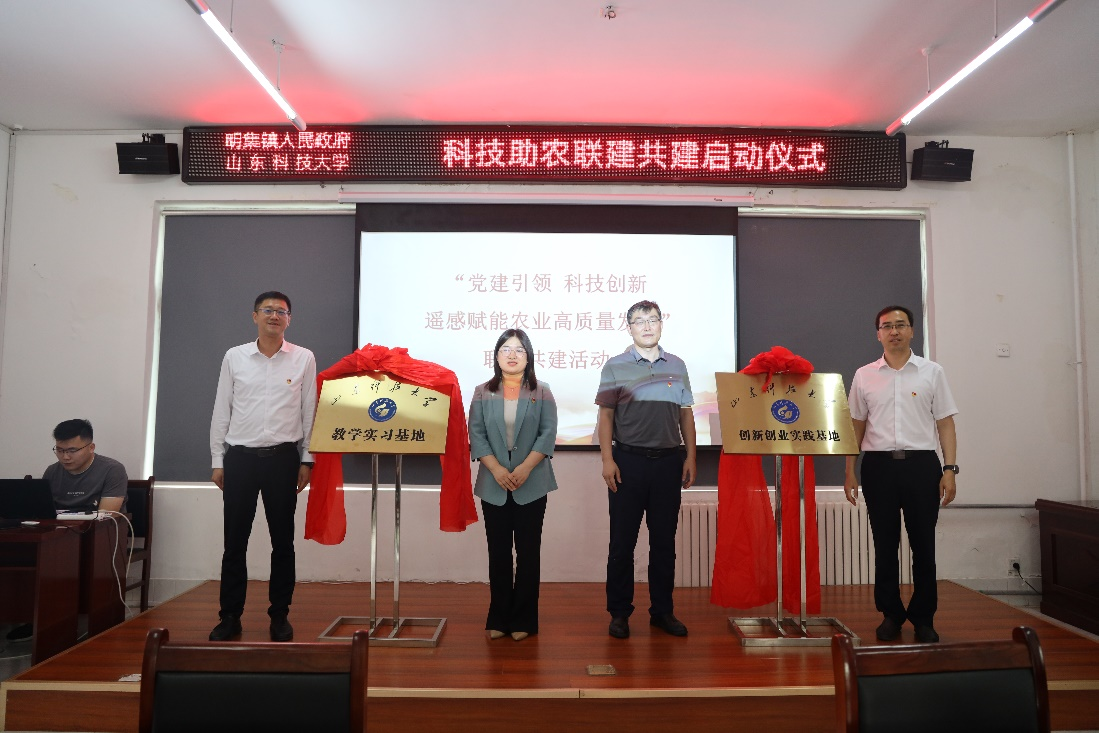 遥感系主任刘健辰与镇党委副书记张传尧签订联建共建协议书,秦昌盛、孙金香、宋明科、张传尧共同为“山东科技大学教学实习基地”“山东科技大学创新创业实践基地”揭牌,邹平市农业农村局副局长孙静为山东科技大学专家代表刘健辰、战丽丽、李振海、亓超颁发聘书。