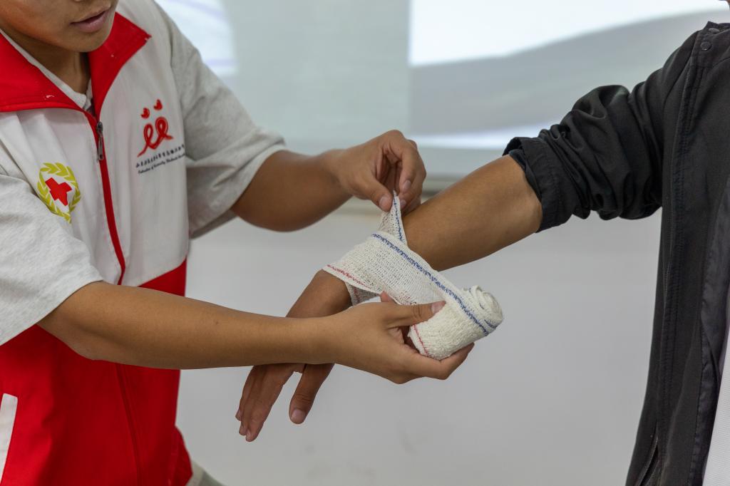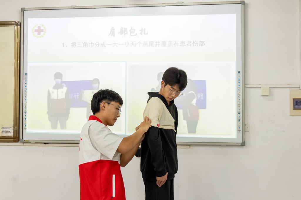 活动邀请了山东科技大学红十字会应急救护与安全避险宣讲团进行宣讲,主要围绕血压测量、常见意外应对措施、心肺复苏与包扎止血四个方面进行。宣讲人员详细演示了心肺复苏的操作流程及体外除颤仪的使用,并创新性地结合音乐《最炫民族风》,帮助同学们更直观地感受胸外按压的频率和节奏。最后,在包扎止血讲解环节,宣讲人员演示了针对胸部、肩部、手部及头部的基本包扎止血方法,并邀请同学们担任模特参与演示。活动中,同学们积极配合,二人一组,踊跃上台练习。