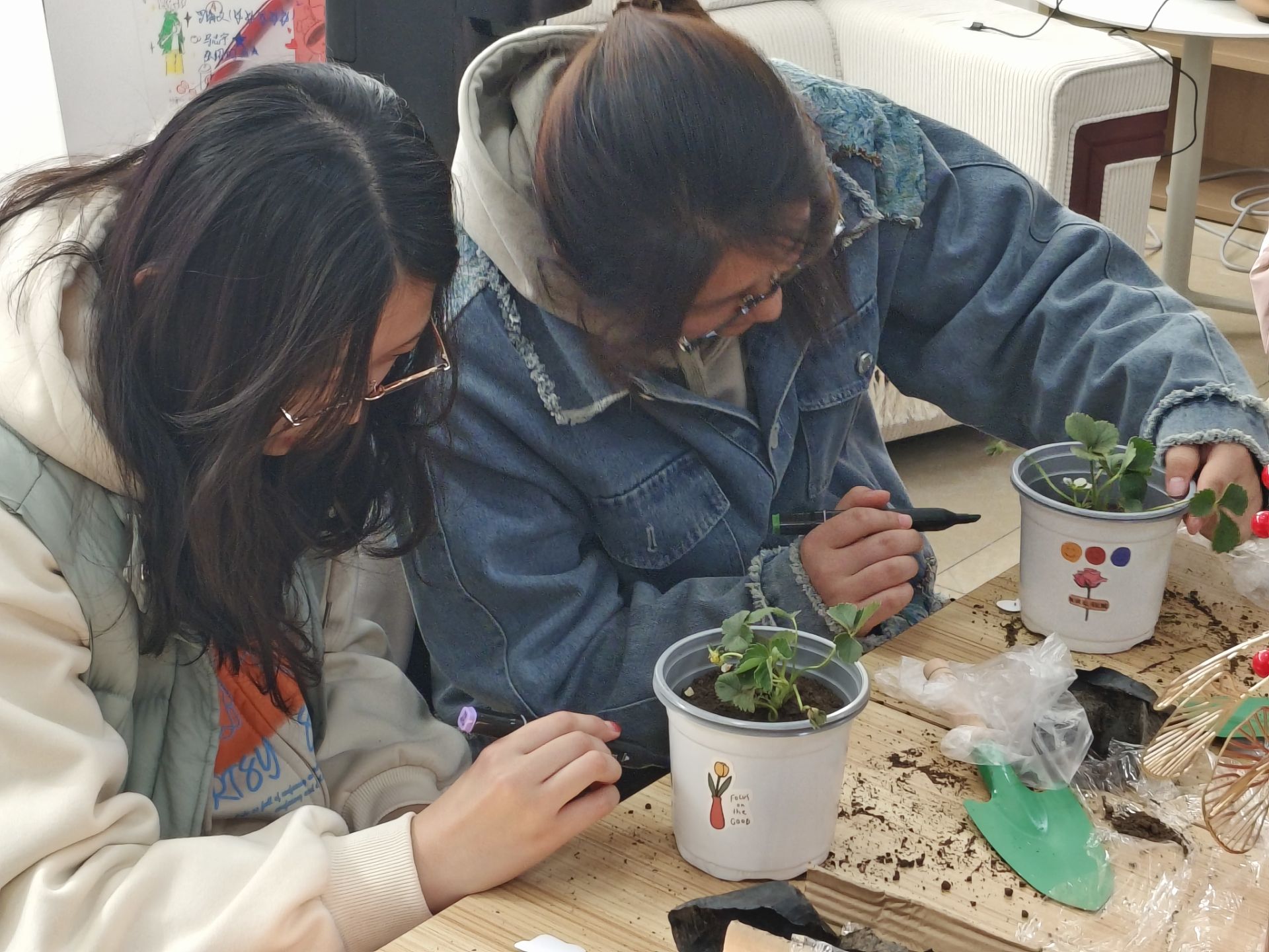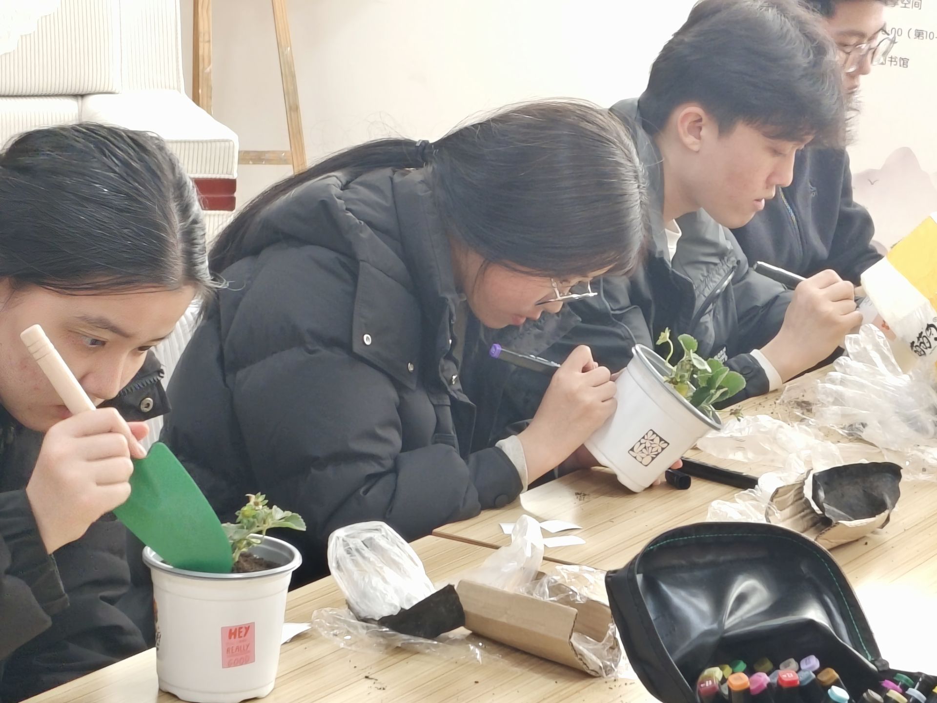 此次活动围绕盆栽种植展开,参加活动的同学首先挑选了自己心仪的幼苗,在现场志愿者的引导下,小心翼翼地用铁铲铲取花土倒入花盆中,随后将土壤轻轻拍实,一株株生机勃勃的幼苗神气地挺立在花盆中。种植完成之后,同学们在自己的花盆上进行了随心DIY,贴上可爱的贴纸、画出有趣的图案,写下心里的寄语,在将近一个小时的忙碌中,每个同学都获得了属于自己的“植树节心晴”盆栽。