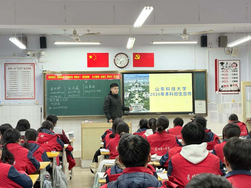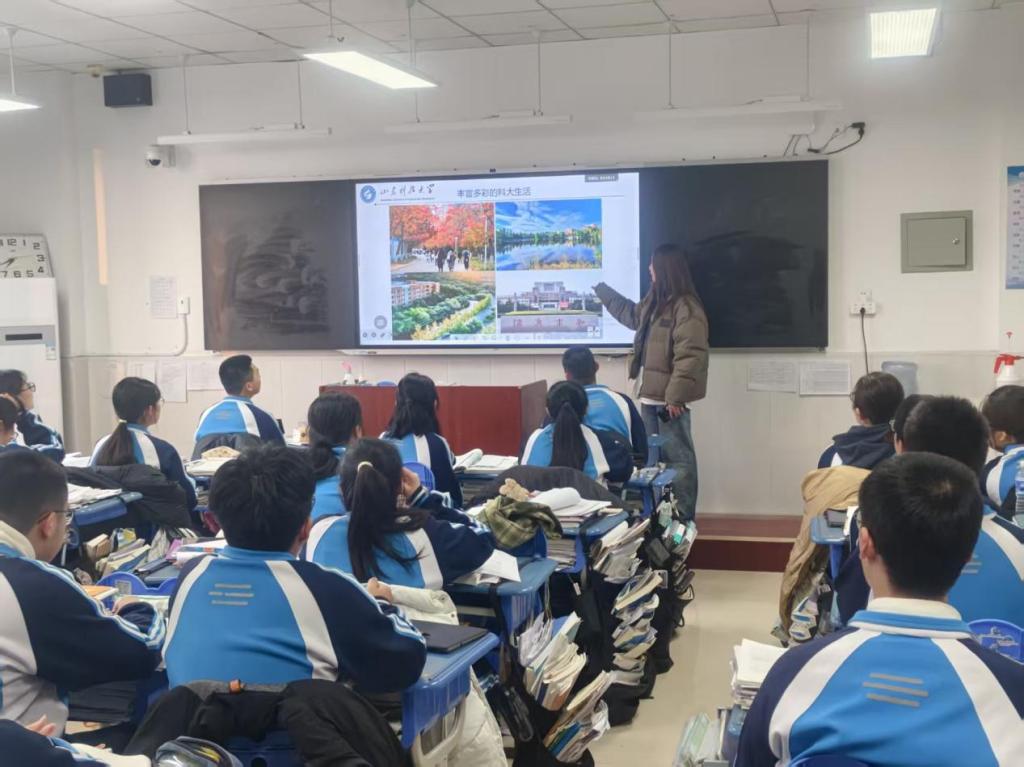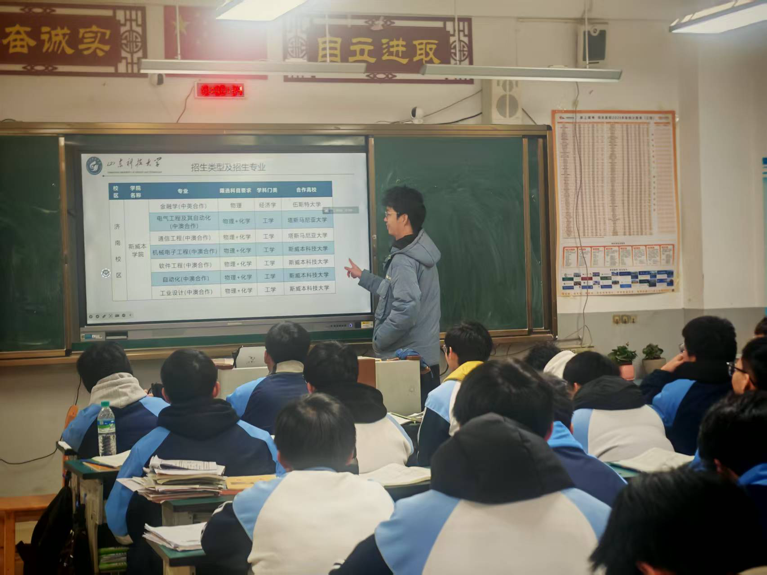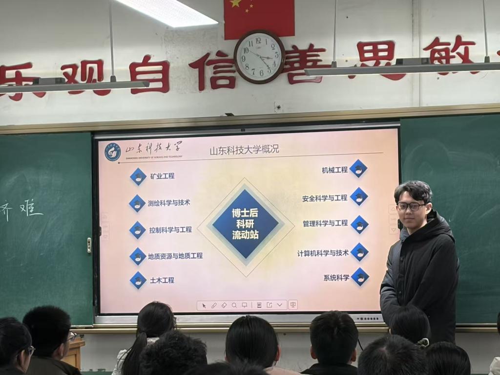 站在曾经奋斗过的高三教室,面对一张张青涩又坚毅的脸庞,我开始了分享。我没有堆砌那些遥不可及的大道理,而是实实在在地向他们介绍了山东科技大学的校园环境、学科特色,以及作为山科学子的日常学习与生活体验。从大学校园的一草一木,到专业课程的有趣日常,再到如何适应从高中到大学的身份转换,我尽量讲得细致又接地气。
