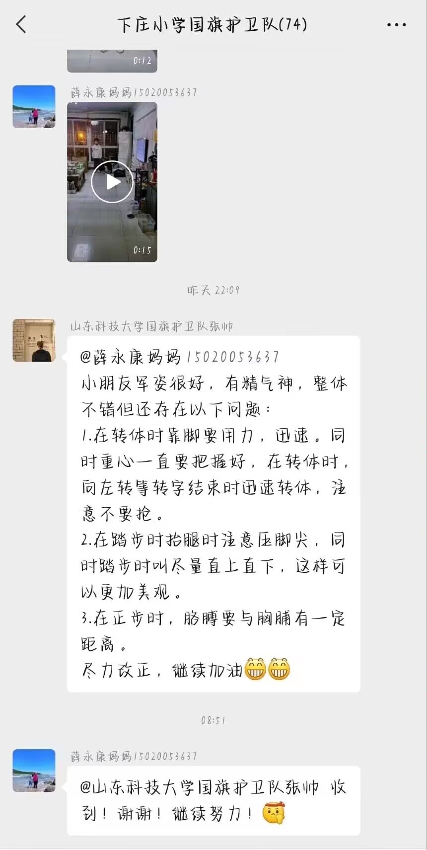 近日,山东科技大学国旗护卫队受邀与下庄小学国旗班举行线上队列动作指导活动。国旗护卫队潘好鑫、孔依凡、李淏涵等7位队员参与指导,下庄小学国旗班全体队员参加。