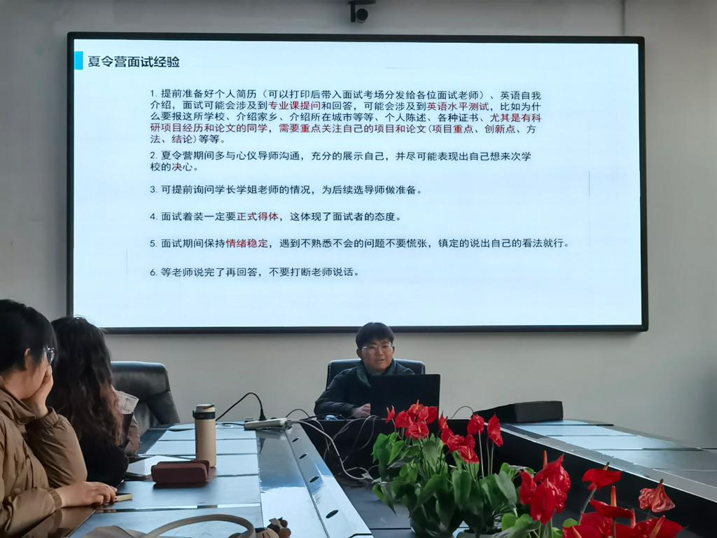 于J6-547会议室举办保研经验分享会,邀请2020级被推免至中南大学李朝阳、中山大学龚梦杰、山东科技大学李文君担任主讲人。本次活动由2021级辅导员张庆禹主持。