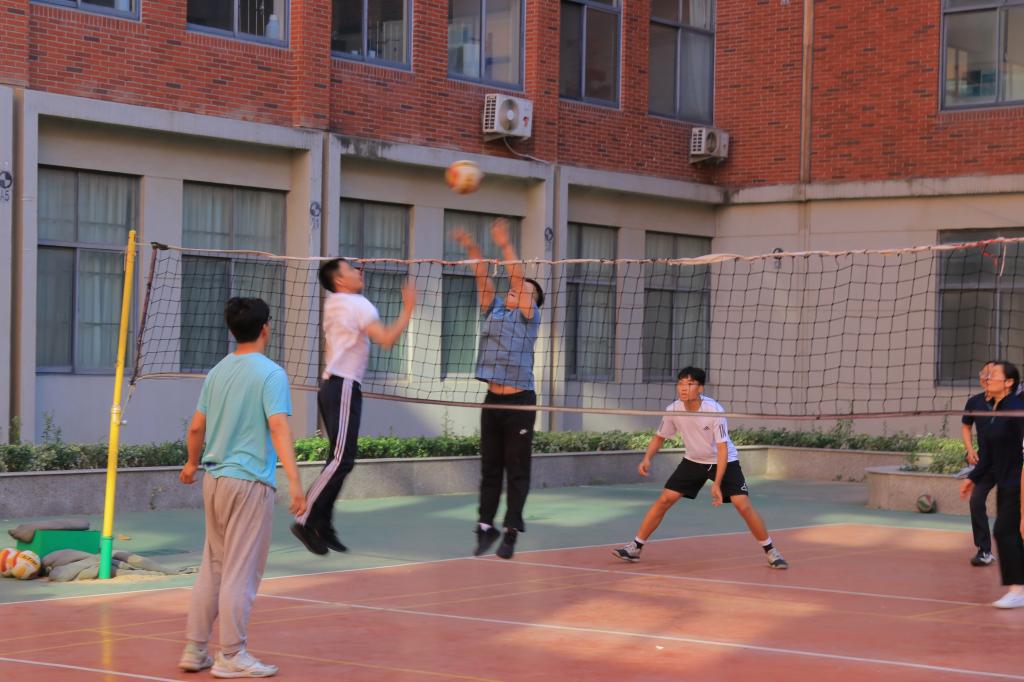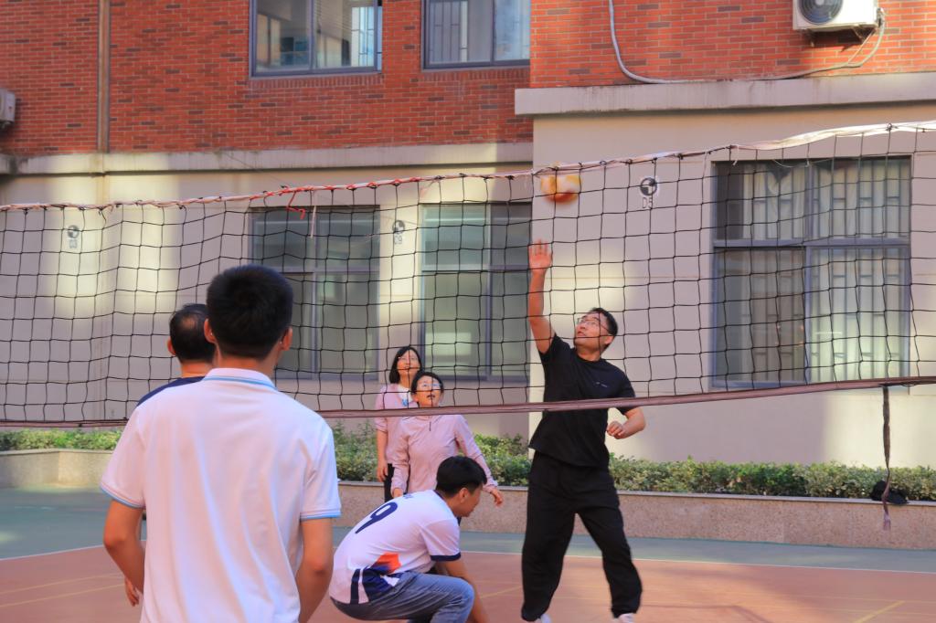 于J6排球场举办师生排球友谊赛。比赛采用师生混合制,增加了活动的灵活性与趣味性。比赛过程中,师生们相互配合,现场气氛热烈。场上的每个回合都充满了激烈的对抗和精彩的表现,现场观众发出阵阵喝彩声。