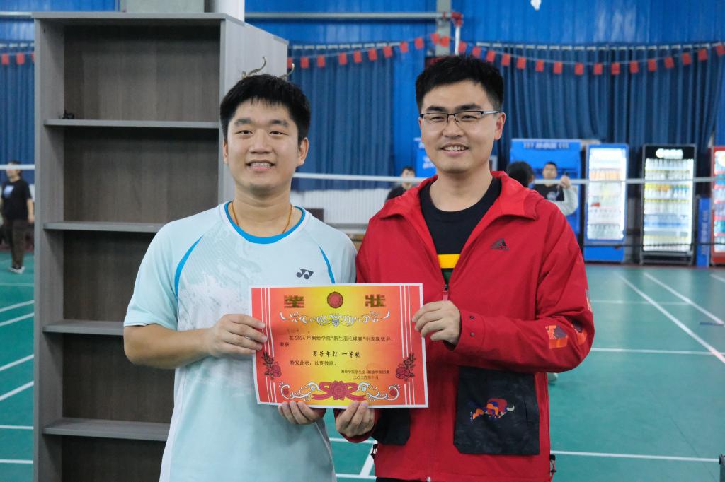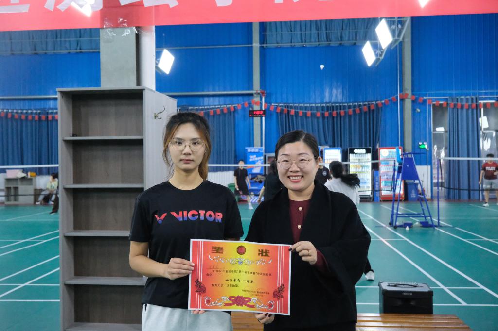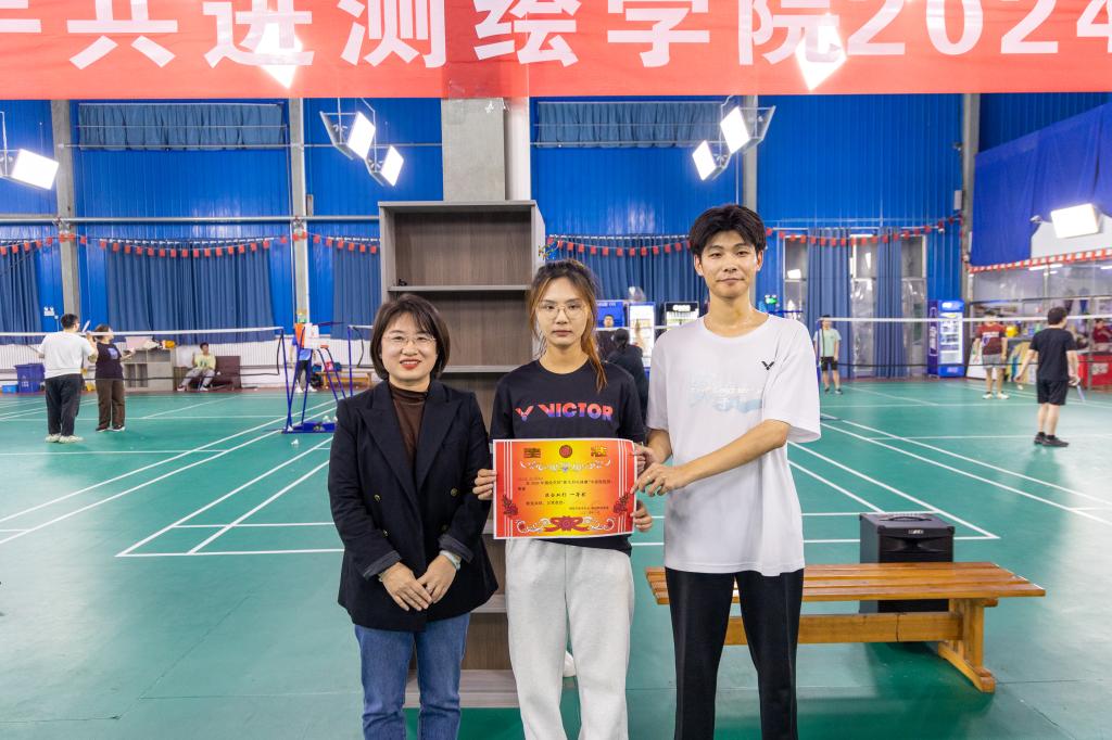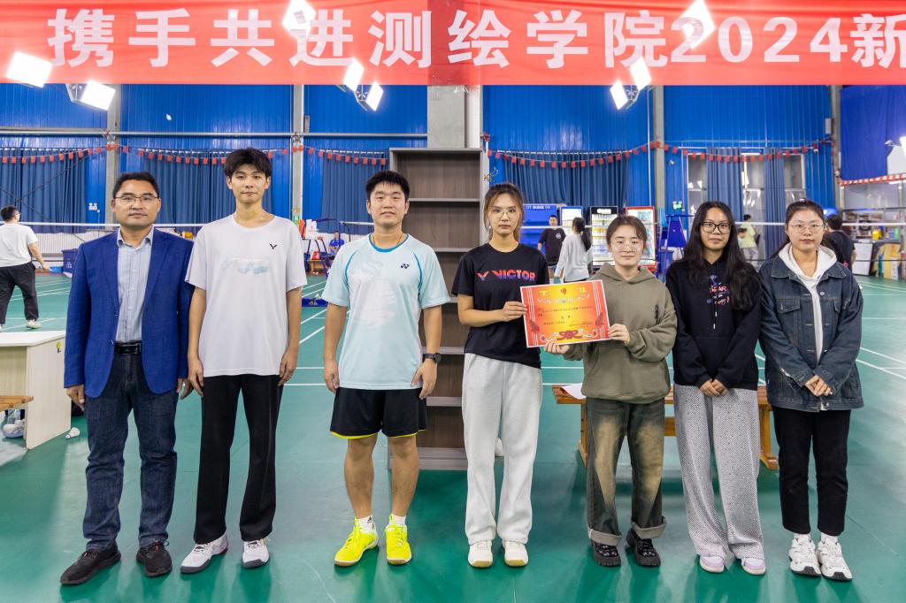 在本次赛事中,共计有15支球队参与角逐,比赛场次达 18 场,含男单、女单和混双三个项目。在单打项目中,选手全神贯注、灵活站位,凭观察力预判击球路线,防守与反击出色,扣杀有力,身姿矫健。双打则更加注重团队合作和默契配合,队员们通过精彩的扣杀和巧妙的配合赢得了在场观众的阵阵掌声。最终硕研24-1班荣获团体冠军,寇晨晨在女单项目中夺冠,胡超与寇晨晨混双折桂,选手李治坤斩获男单冠军。颁奖仪式上,学院党委副书记兼副院长吴昊,学工办主任、团委书记孙金香,以及辅导员韩雪丽、牛盛光出席为获奖者颁发奖状并共同合影留念,记录下这一荣耀瞬间。