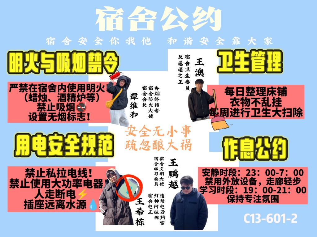 在公约设计过程中,各宿舍成员围绕公寓安全、卫生规范、作息制度、人际交往等内容展开深入讨论,集思广益,最终创作出各具特色的宿舍文明公约。这些公约不仅明确了宿舍成员的行为准则,也为构建温馨和谐的生活环境提供了制度保障。公约制定完成后,各宿舍立即着手整改落实,宿舍整体风貌焕然一新,展现出积极向上的精神面貌。经评审,最终评选出一等奖5个、二等奖8个、三等奖13个。
