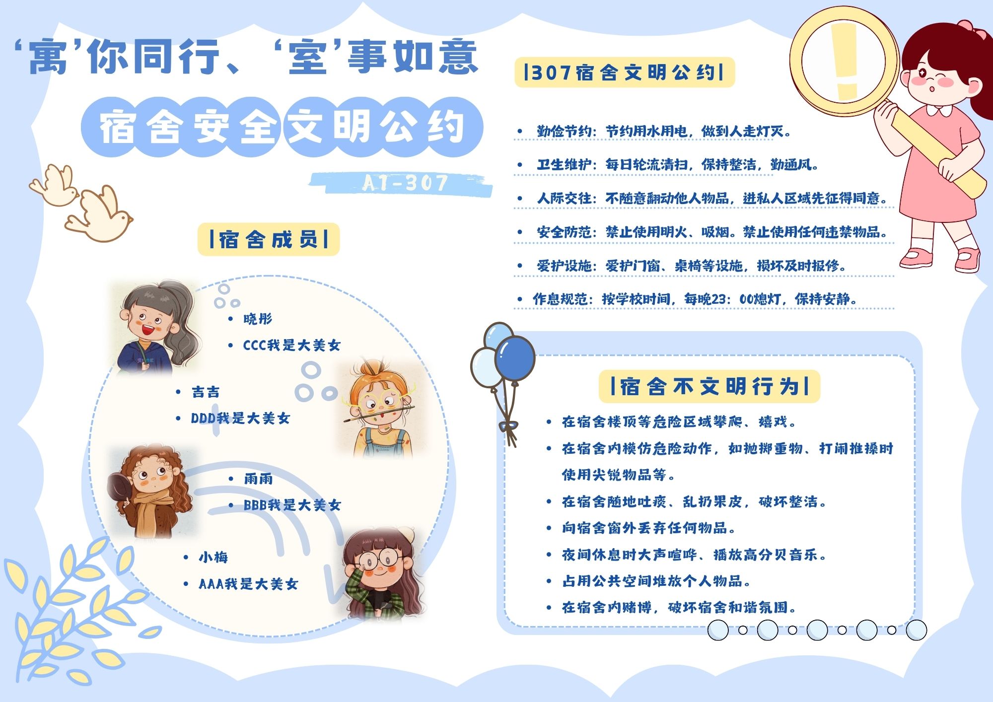 研究生会举办了“‘寓’你同行、‘室’事如意”宿舍安全文明公约设计活动。本次活动得到了广大研究生的积极响应,共吸引了51间宿舍、200余名同学踊跃参与,共收到51份制作精美的宿舍公约作品。