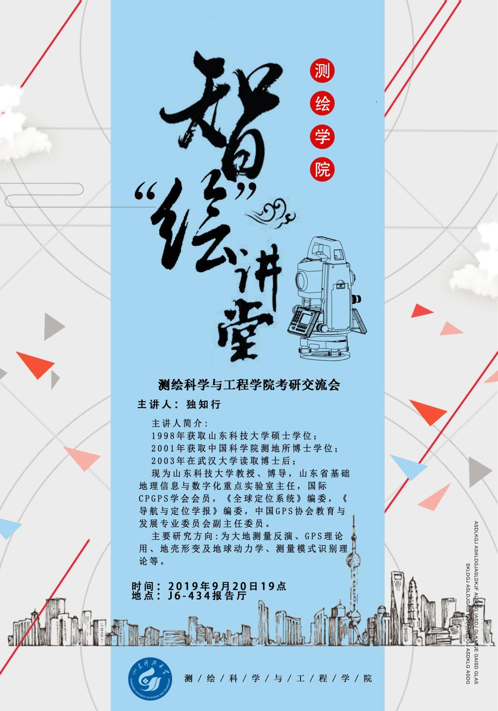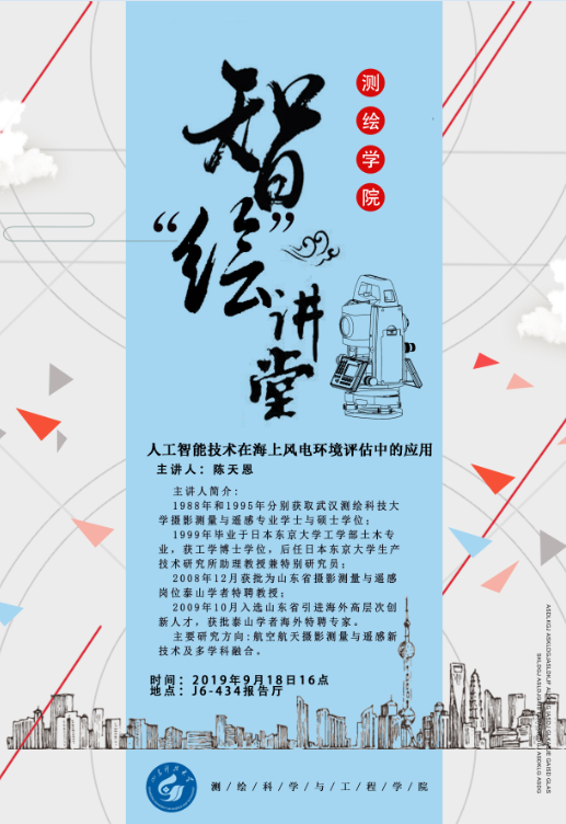 2019年9月18日下午,测绘科4学与工程学院智“绘”讲堂第十期在J6楼434学术报告厅成功举办。本期智“绘”讲堂邀请到泰山学者海外特聘专家陈天恩教授,为大家作题为“人工智能技术在海上风电环境评估中的应用”的讲座,...