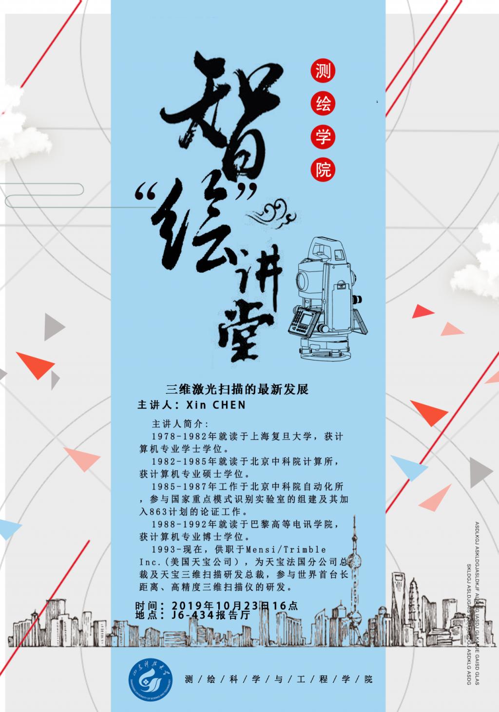 2019年10月23日下午16时,测绘科学与工程学院智“绘”讲堂第十二期在J6教学楼434学术报告厅成功举办。本期智“绘”讲堂邀请到天宝法国分公司总裁及天宝三维扫描研发总裁Xin CHEN博士作了题为“三维激光扫描的最新发展...