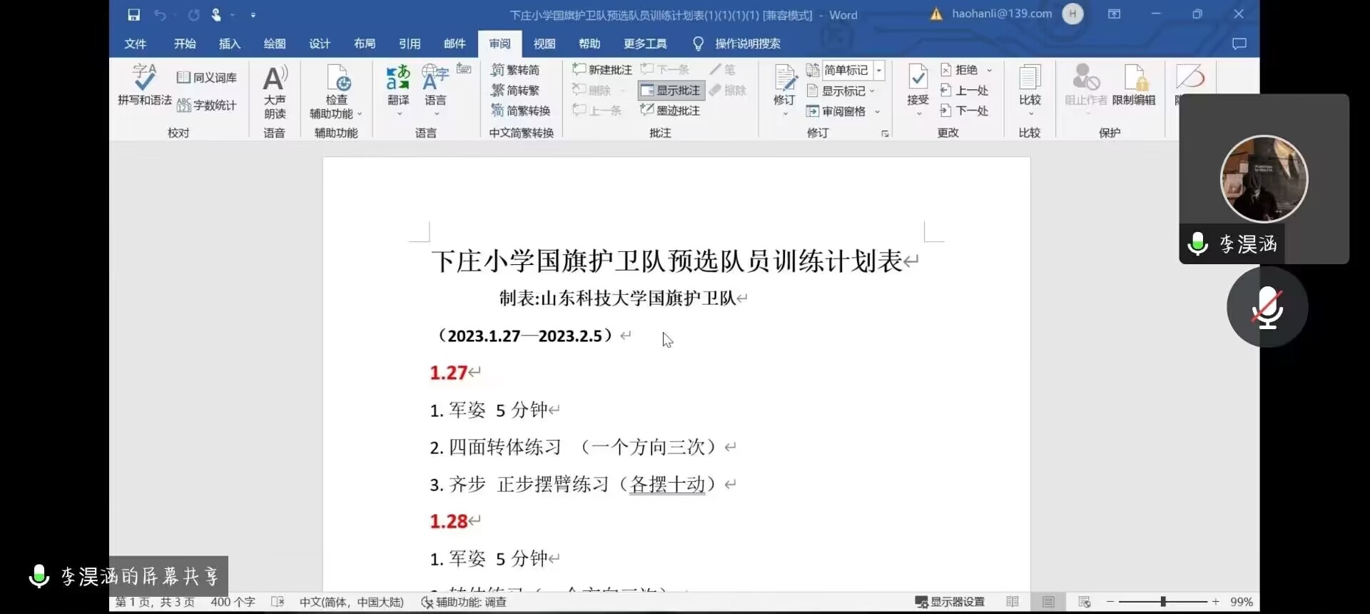 近日,山东科技大学国旗护卫队受邀与下庄小学国旗班举行线上队列动作指导活动。国旗护卫队潘好鑫、孔依凡、李淏涵等7位队员参与指导,下庄小学国旗班全体队员参加。在本次活动为期10天,1月27日,指导小组召开线上动员大会,促进下庄小学国旗班小队员与指导小组7名队员的互相了解。队员孔依凡通过PPT的形式向小队员们进行队列动作详解及具体展示,李淏涵介绍假期训练计划以及基本要求。同时,在会议中通过连麦和弹幕的方式与小...