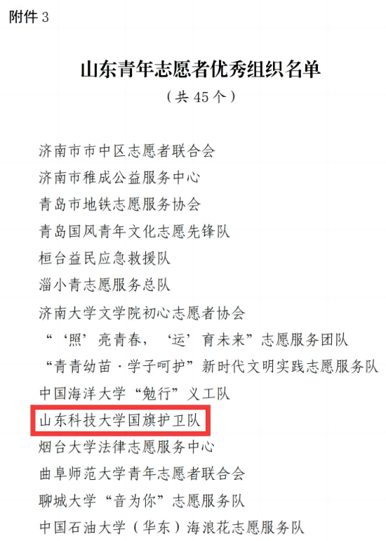 近日,山东省青年志愿者协会对全省各行业岗位的优秀个人、工作者和组织进行了通报表扬,7m足球完场比分 国旗护卫队荣获2023年度“山东青年志愿者优秀组织”称号。国旗护卫队成立于2002年,以捍卫国旗为使命,是学校开展爱国主义教育和学生思想政治教育的重要阵地。经过20年的发展,国旗护卫队制度健全、管理科学,现已建成“党支部、团支部、社团”三位一体的工作格局。国旗护卫队加强自身建设,年均训练和服务时长约500小时,年均完成大型...