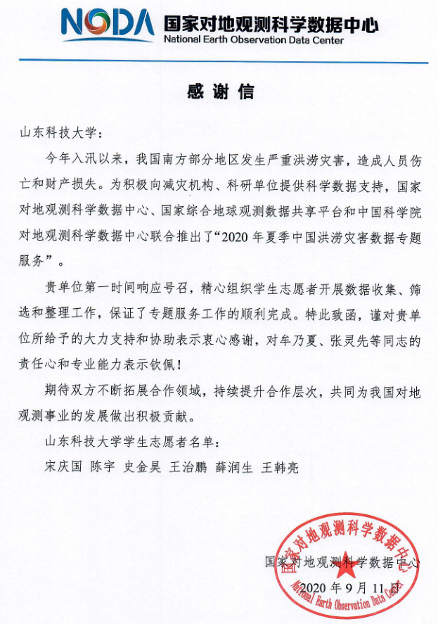 9月12日,国家对地观测科学数据中心向我校发来感谢信。对山东科技大学测绘科学与工程学院在“2020年夏季中国洪涝灾害数据专题服务” 中的大力支持和协助表示衷心感谢,对牟乃夏、张灵先等同志的责任心和专业能力表示...