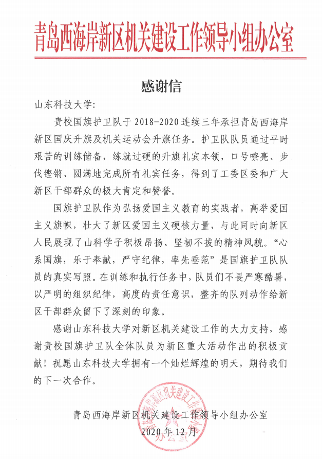 日前,我校收到来自青岛西海岸新区机关建设工作领导小组办公室发来的《感谢信》。信中,对我校国旗护卫队连续三年承担青岛西海岸新区国庆升旗及机关运动会升旗任务表示感谢,对护卫队员表现出的过硬本领和优良品格给...