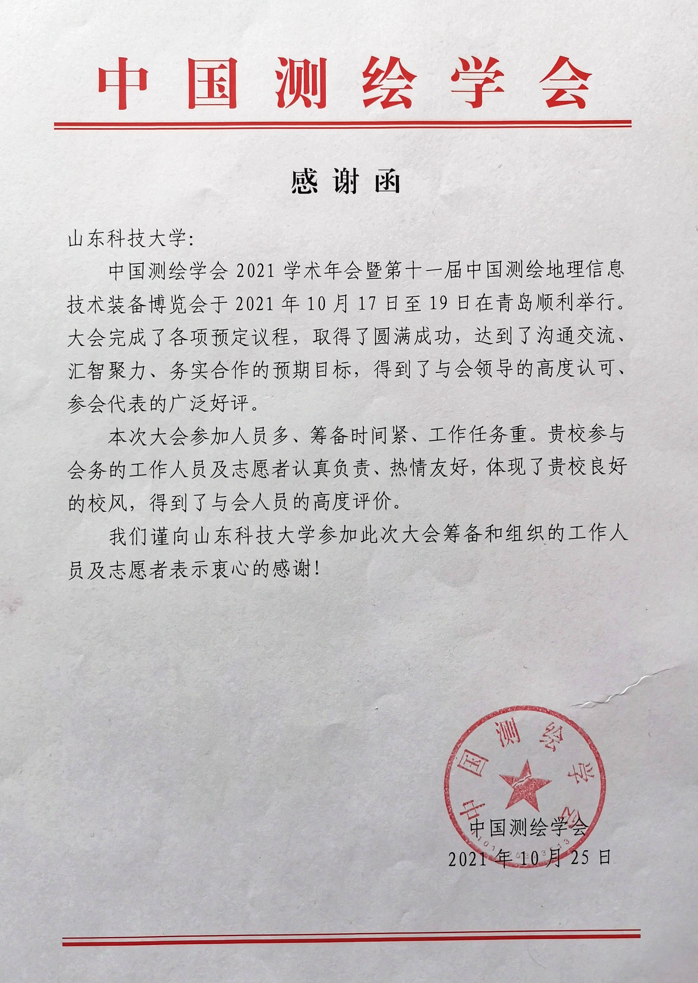 我校收到中国测绘学会的感谢函