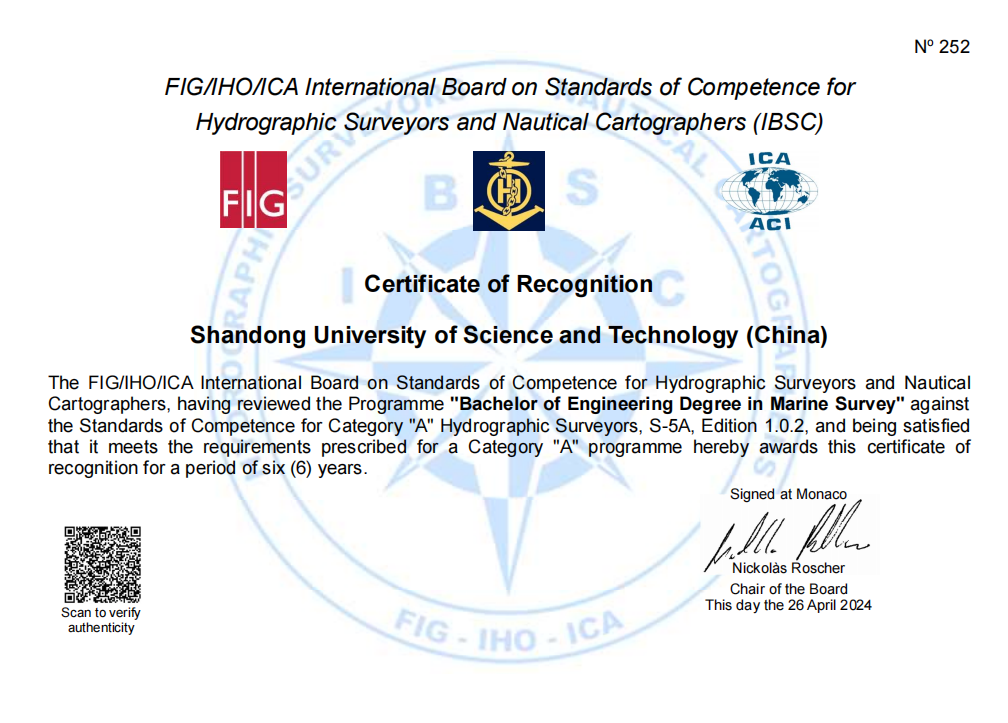 近日,由国际测量师联合会、国际海道测量组织和国际制图协会(FIG/IHO/ICA)联合组成的国际海道测量师和海图制图师能力标准委员会(IBSC)发来函告:完场比分-7m足球完场比分 “海洋测绘工程工学本科专业教学计划”获得国际A级认证。山东科技大学成为国内非军方高校唯一获得该资质的单位。 该资质经过学校前期材料准备、提报、国际专家审查,于2024年4月17日进入答辩程序,答辩采用远程线上形式开展,由完场比分 及学校...