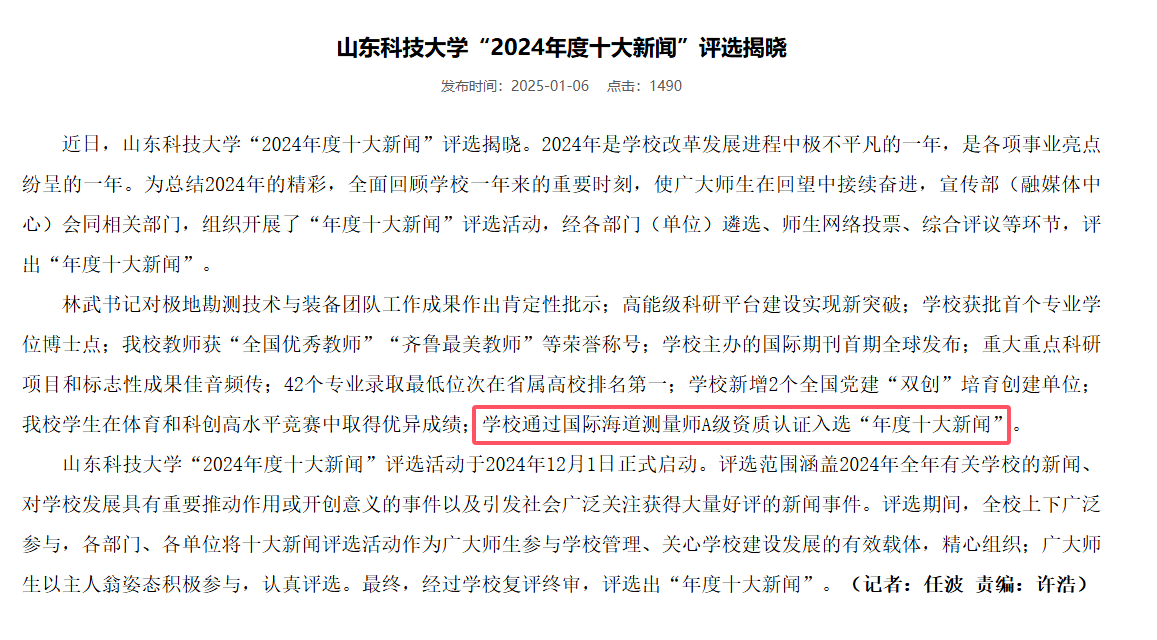 12月,学校“海洋测绘工程工学本科专业教学计划”获国际海道测量师和海图制图师能力标准委员会(IBSC)国际A级认证。我校成为国内非军方高校唯一获得该资质的单位。目前全球获得海洋测绘工程工学本科专业教学计划A级认证的单位仅有20个。该资质的取得将为维护我国海洋权益、促进海道测量数据资源共享和开发利用、保障国家海洋发展战略、服务共建“一带一路”提供智力支持。附链接:山东科技大学“2024年度十大新闻”//www...